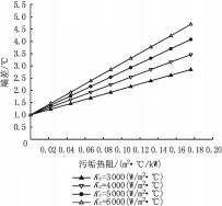 假設(shè)冷凝器的冷卻水進(jìn)出水溫差為5℃,冷卻水側(cè)換熱表面清潔時(shí)冷凝器端差為1℃,即傳熱溫差為3.5℃。圖2顯示了冷凝器清潔狀態(tài)下傳熱系數(shù)Kc不同時(shí)污垢熱阻對(duì)端差的影響,Kc越大,污垢熱阻對(duì)端差的影響越顯著。