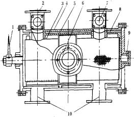 1.操作手柄2.進水管3.收球網4.清洗器外殼5.分水器6.總進水管7.膠球投放口8.換向閥9.銅軸承10.排水管