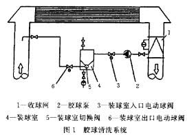 裝球室加裝逆止門前后運行程序的比較目前安裝在電廠中的膠球清洗系統(最一常用于50MW以上機組的單循環制系統)其系統見圖1。