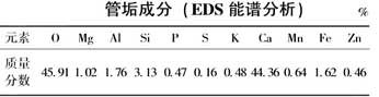 3)刮取管內(nèi)垢樣進(jìn)行成分分析見圖,從分析結(jié)果看,主要成分包括鈣44.36%,鎂1.02%,硅3.13%等易形成硬垢的成分,此外還有磷、鋅、鐵等成分應(yīng)是阻垢劑成分和腐蝕產(chǎn)物在管壁內(nèi)沉積的產(chǎn)物;