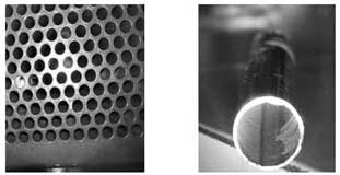 1)現(xiàn)場(chǎng)檢查情況見圖,其中的凝汽器的TP304不銹鋼管內(nèi)壁結(jié)垢普遍,呈深灰褐色,個(gè)別管結(jié)垢呈淺藍(lán)色或褐黃色;對(duì)凝汽器換管隨機(jī)割管,管內(nèi)水垢分兩層結(jié)垢,外層疏松易脫落;內(nèi)層結(jié)垢緊密,質(zhì)地堅(jiān)硬,內(nèi)層水垢呈灰白色;