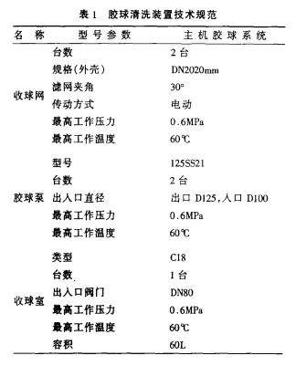 山西電廠捷制500MW機(jī)組主機(jī)凝汽器配套的膠球清洗裝置包括活動(dòng)式收球網(wǎng)、膠球泵、裝球室、膠球再循環(huán)管路、膠球再噴射裝置、膠球再循環(huán)監(jiān)督裝置和差動(dòng)壓力測(cè)量系統(tǒng)等。其作用是在機(jī)組運(yùn)行過(guò)程中,供助水流將海綿膠球擠過(guò)凝汽器銅管,并不斷循環(huán),擦洗掉銅管內(nèi)的垢物,提高熱交換效率,降低凝汽器端差,提高汽輪機(jī)組真空.技術(shù)規(guī)范見(jiàn)表1。
