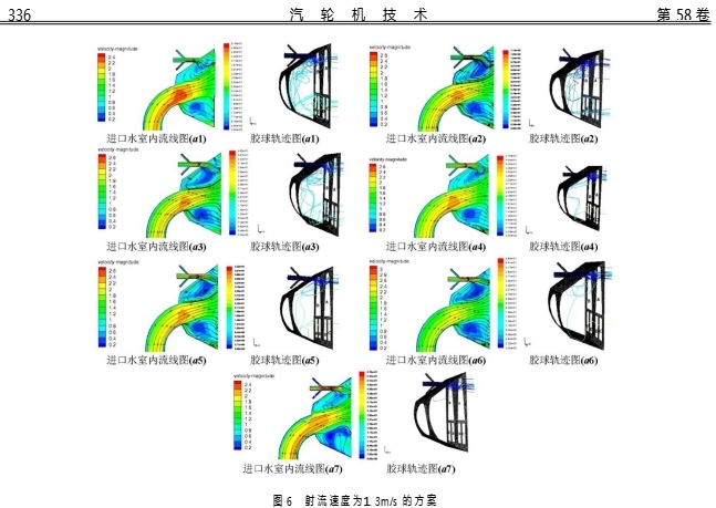 1m/s,a1表示射流速度U=1.3m/s、膠球速度V=1m/s。射流速度為1.3m/s時結果分析圖6表示對A區域上部分冷卻管束進行清洗,射流速度為1.3m/s時,送球速度分別為1.0m/s、1.2m/s、1.4m/s、1.6m/s、1.8m/s、2.0m/s、2.2m/s,進口水室內的流線圖和膠球軌跡圖。對膠球通過A、B、C、D、E、F6個區域的情況進行統計,結果見表1。