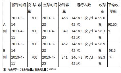 1)膠球清洗裝置自調試投用以來,已累計運行10個月以上,各項性能考核指標優良:收球率平均值在98%以上,收球網水阻小于3kPa,設備運行穩定,未出現故障和缺陷(見表1)。表1膠球清洗裝置運行記錄(2013年3、4月份)