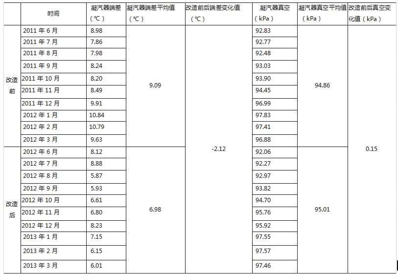 2)將膠球清洗裝置改造前后各10個月的凝汽器運行參數進行對比分析(見表2),可以看出凝汽器端差平均降低了約2.12℃,真空平均提高了約0.15kPa。端差降低較為顯著,說明凝汽器換熱性能得到改善;真空的提高幅度不大,這應是受到了其它一些因素干擾,如機組真空系統嚴密性變差、抽氣器抽氣能力下降等。電廠擬在后續工作中對機組真空系統嚴密性作一次全面、細致的檢查,對抽氣器的工作性能進行改進,以進一步提高凝汽器真空度。
