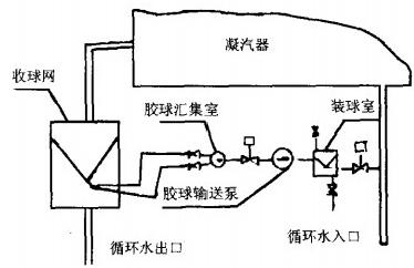 膠球清洗,凝汽器膠球清洗裝置系統由膠球泵、裝球室、分匯器、收球網及閥門等組成。它的工作原理是:清洗球在水流壓力的作用下,從冷卻水系統的進水管進入凝汽器的冷凝水管,洗擦掉管內壁的污垢,清洗球流至冷卻水系統的出口,通過一個篩板裝置,將清洗球從冷卻水里篩濾出來。篩濾出的清洗球由一臺回收泵抽走,然后按自動化要求程度的不同,通過一個清洗球自動篩選器或者一個閘板式清洗球收集器,再由泵送到冷卻水系統的人口,如圖1所示。