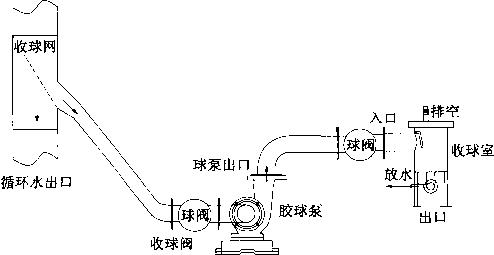 2)各管路和彎頭的安裝按圖1進行。收球網的出膠球口必須高于膠球泵入口0.5m及以上;各接口有彎頭過渡連接的,彎頭要大于或等于90。彎徑好大于2.5倍管徑。